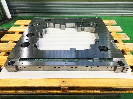 本製品は非常に厳しい精度が求められ、比較的大物品(750×750)である上で基準穴からの穴ピッチ間±0.01以内での加工をジグボーラー加工により実現しています。また、平坦度も0.015以内を求められる上に、形状として中心に大きい空間があるため、ジグボーラー加工を行う前の研削加工時に十分に注意した段取りと加工を行っております。精密機械加工品であるがゆえに、ジグボーラー・研削盤を用いた精密機械加工を行うことができる弊社の強みが活かせている製品です。