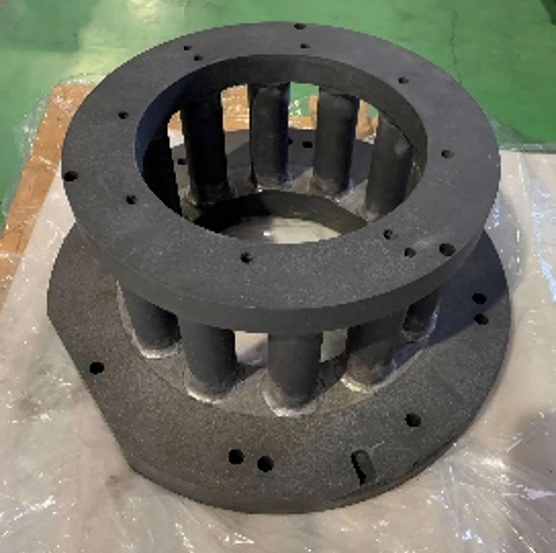 人命に関わり安全性が強く求められる航空機のブレード部品を製造するために利用される治具となるため、最高レベルの精度で仕上げた製品であり、また、最終製品の形状と工程の設計内容に合わせて、治具の設計から溶接、リン酸マンガン処理、、精密機械加工、研磨加工、ジグボーラーによる精密位置決め加工まで、一貫生産にて対応を行った製品となります。材質がS45Cとなるため、表面処理や溶接にもノウハウを要する加工でしたが、弊社の高い材質への理解を活かし、公差レベル平行・平坦度0.01以内、基準穴ピッチ0.01以内の高精度に仕上げております。
